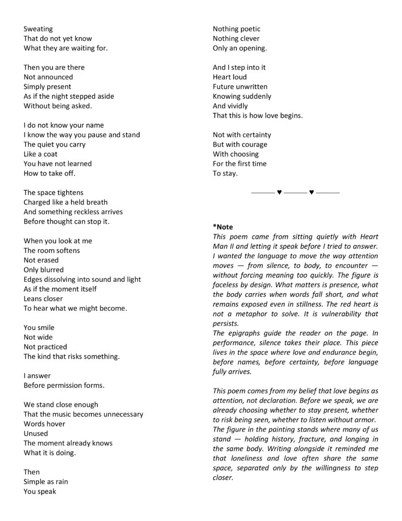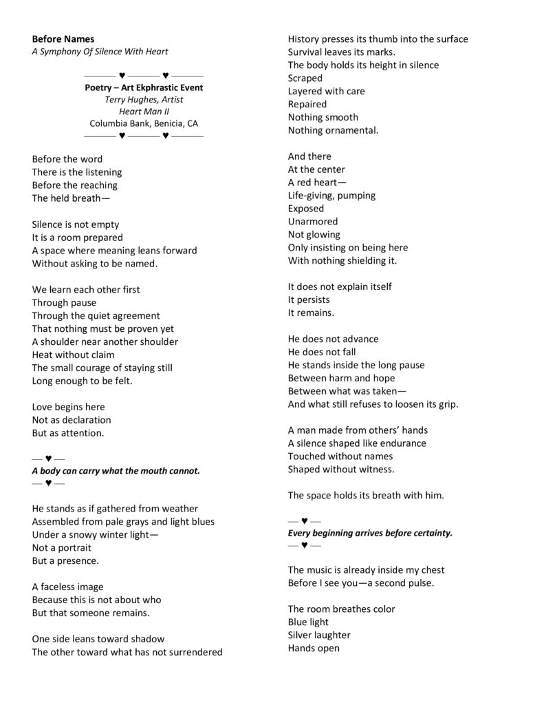 Heart Man ll by Terry Hughes, Oil on Canvas 48×36 Poem Attached Below Read more articles Previous PostCROWNED by Carla Lawson, Vacaville Museum Next PostDancers by Myla J- 11×14 Acrylic You Might Also Like CROWNED by Carla Lawson, Vacaville Museum February 8, 2026 Donald O Greene, Artist and Art Show February 8, 2026 Dancers by Myla J- 11×14 Acrylic February 20, 2026